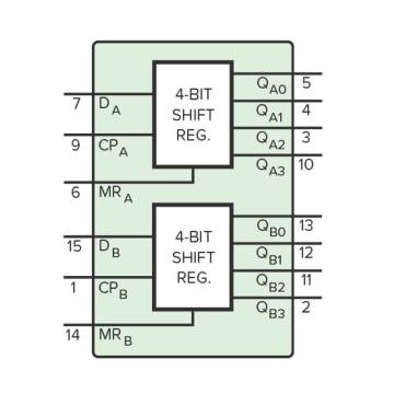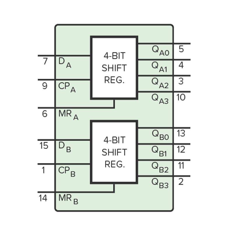 El CD4015BE es un IC CMOS con dos registros de desplazamiento de 4 bits.