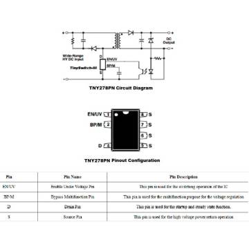 El TNY278PN es un circuito integrado de conmutación fuera de línea diseñado para simplificar el desarrollo de fuentes de alimentación AC-DC. Combina MOSFET de potencia, controlador ON/OFF y protecciones de seguridad en un solo chip, reduciendo el número de componentes externos y mejorando la eficiencia del sistema.