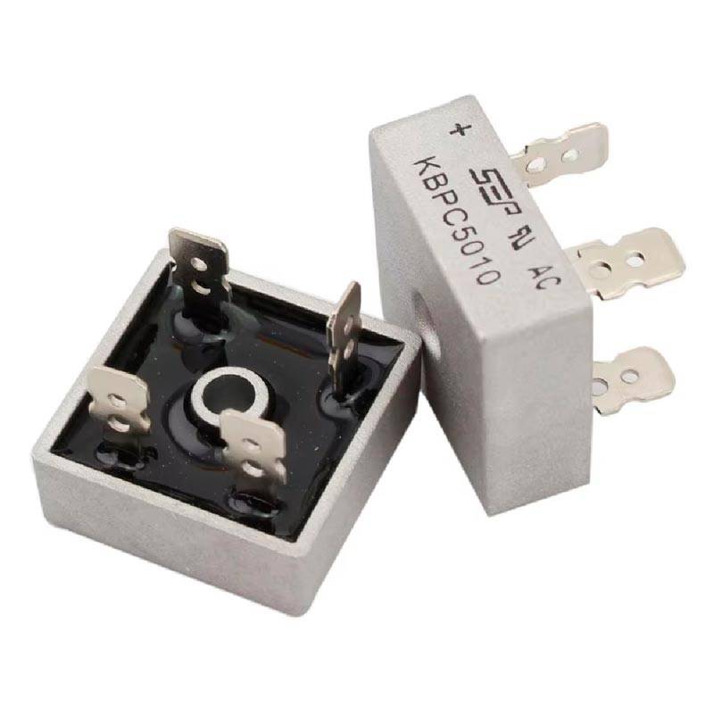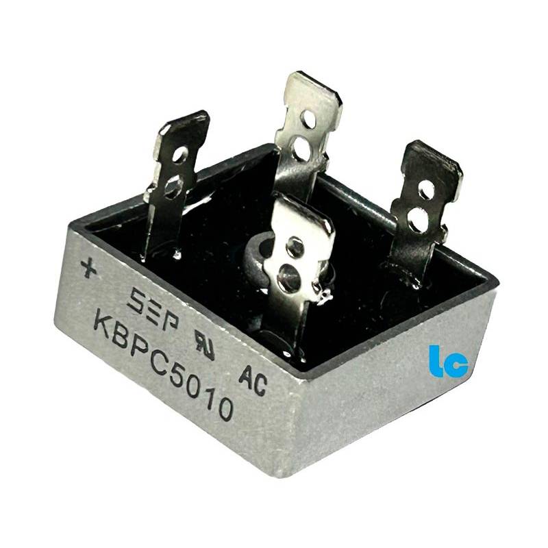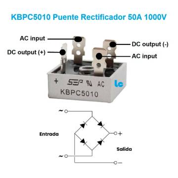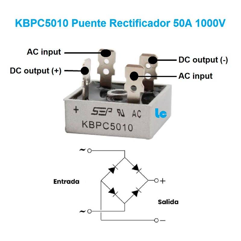 El KBPC5010 es un puente rectificador de alta potencia, capaz de manejar hasta 50A de corriente y soportar voltajes de hasta 1000V.